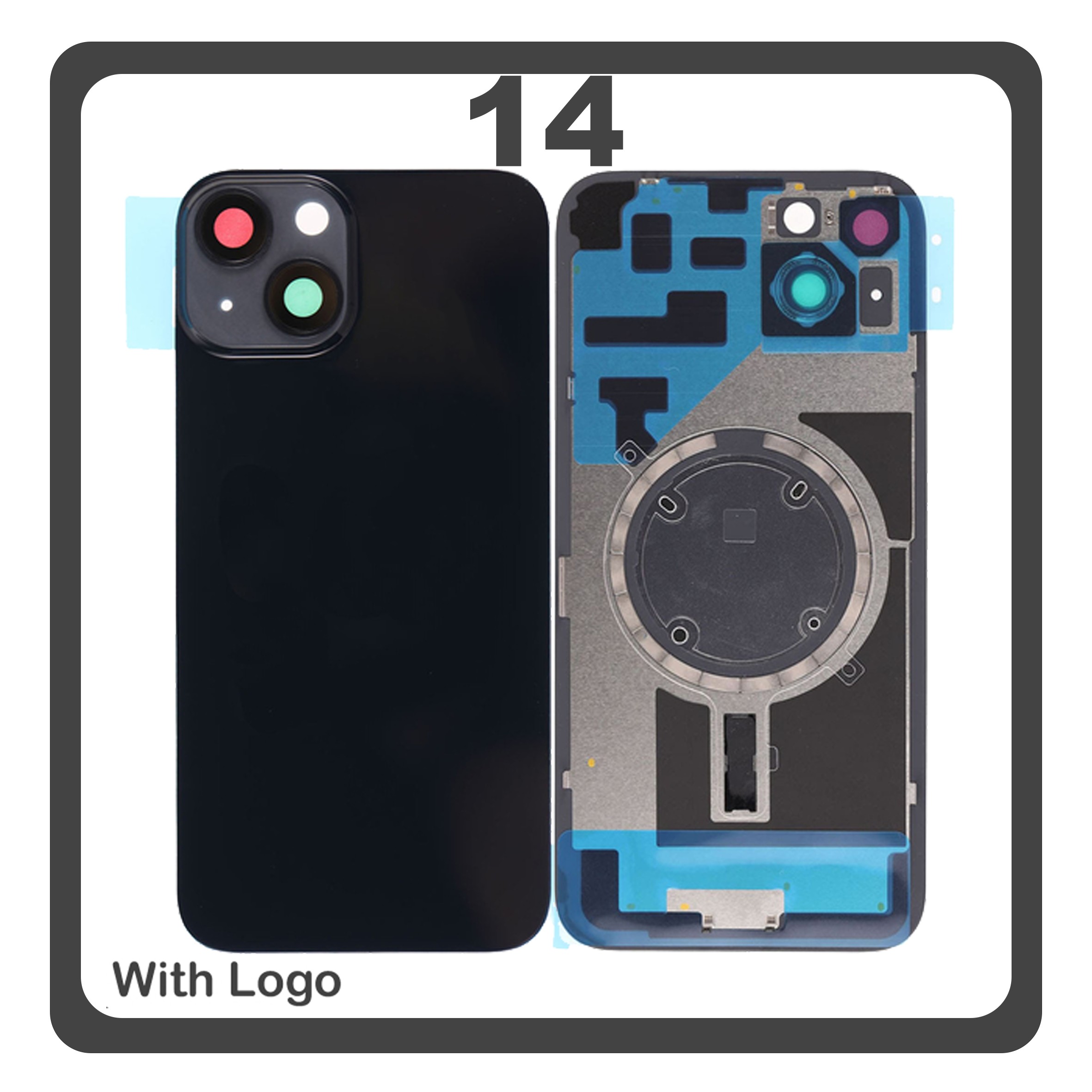 HQ OEM Συμβατό Με Apple iPhone 14, iPhone14 (A2882, A2649) Rear Back Battery Cover Πίσω Κάλυμμα Καπάκι Πλάτη Μπαταρίας + Metal Plate + Camera Lens Τζαμάκι Κάμερας + Magsafe Midnight Black Μαύρο (Premium A+)