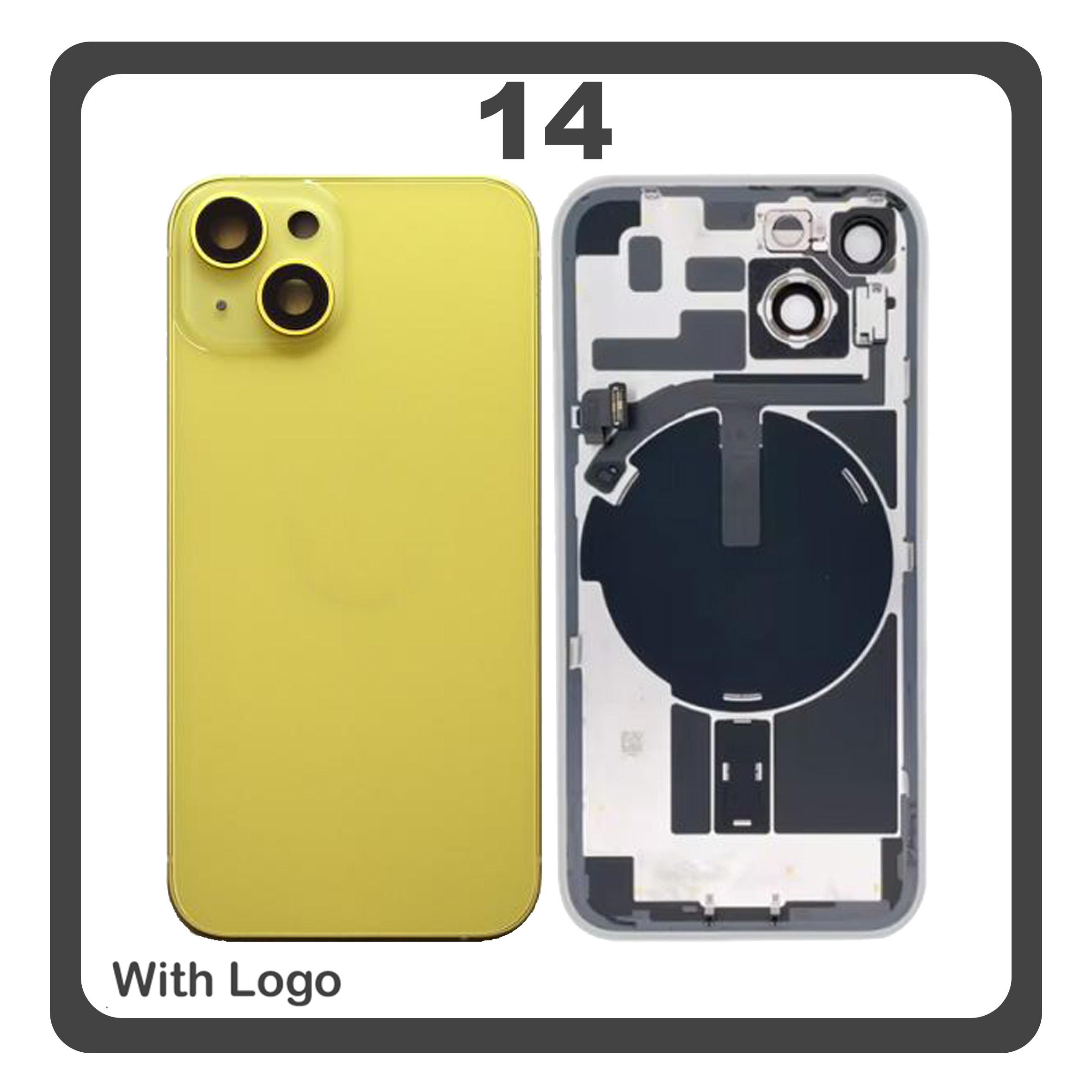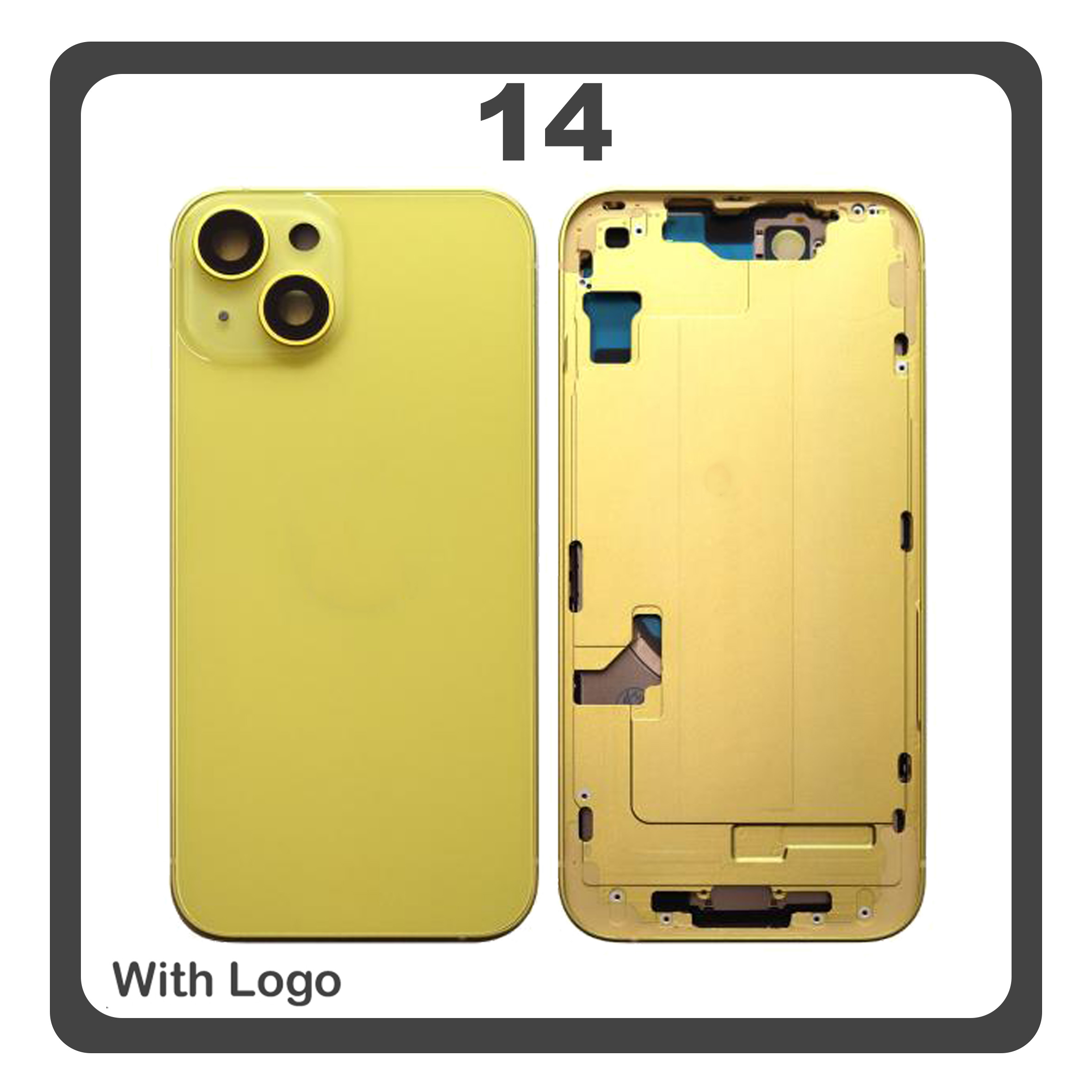 HQ OEM Συμβατό Με Apple iPhone 14, iPhone14 (A2882, A2649) Rear Back Battery Cover Middle Frame + Housing Πίσω Κάλυμμα Καπάκι Πλάτη Μπαταρίας - Σασί + Camera Lens Τζαμάκι Κάμερας + Side Keys + Sim Tray Θήκη Κάρτας + Flashlight + NFC Yellow Κίτρινο (Premium A+)