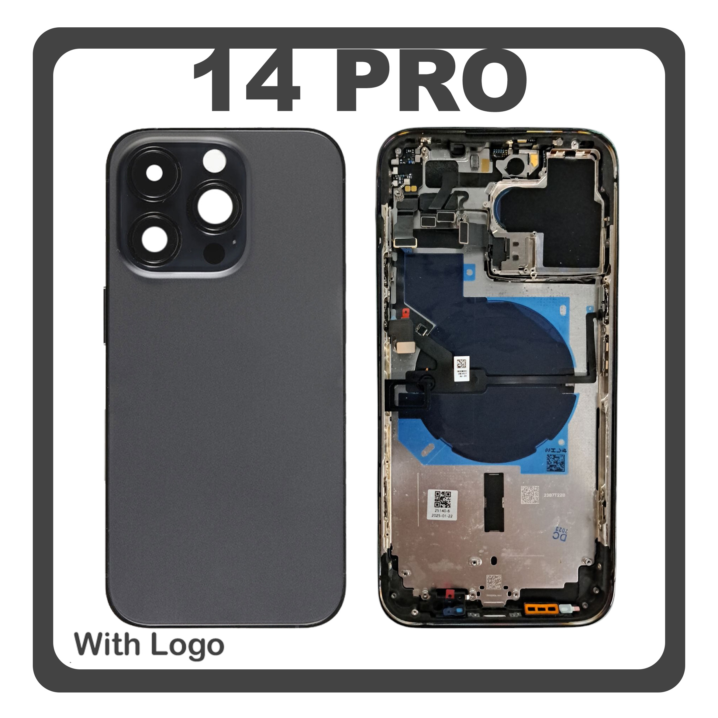 HQ OEM Συμβατό Με Apple iPhone 14 Pro (A2890, A2650) Rear Back Battery Cover Middle Frame- Housing Πίσω Κάλυμμα Καπάκι Πλάτη Μπαταρίας + Power Button + Volume Button Flex Cable + Sim Card Tray + Flashlight Flex + NFC Black Μαύρο (Premium A+)