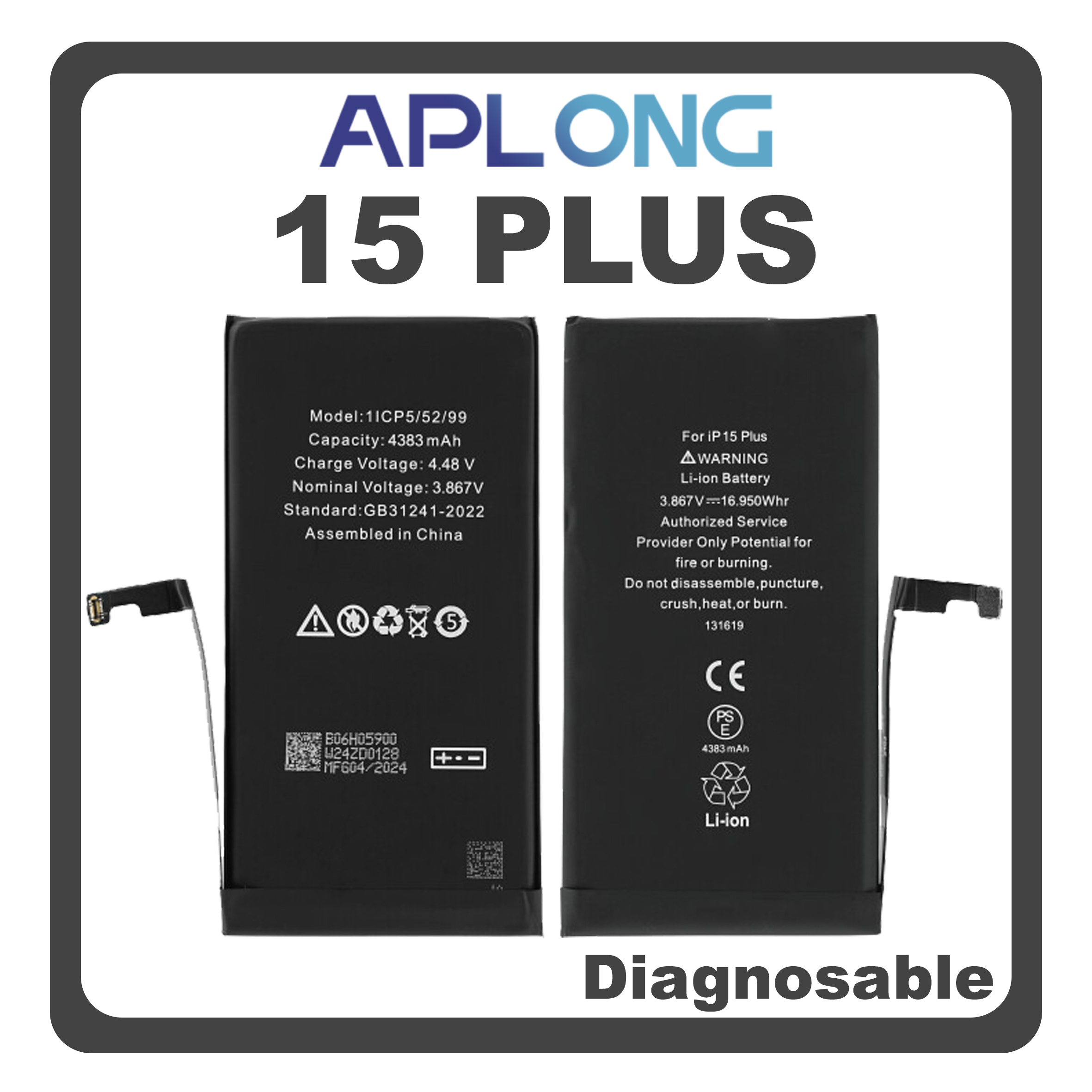 HQ OEM Συμβατό Με iPhone 15 Plus, iPhone 15+ (A3094, A2847) APLONG Battery Μπαταρία Li-Ion 4383 mAh Diagnosable Bulk (Premium A+) (1 Year Warranty Για Συνεργατες B2B)