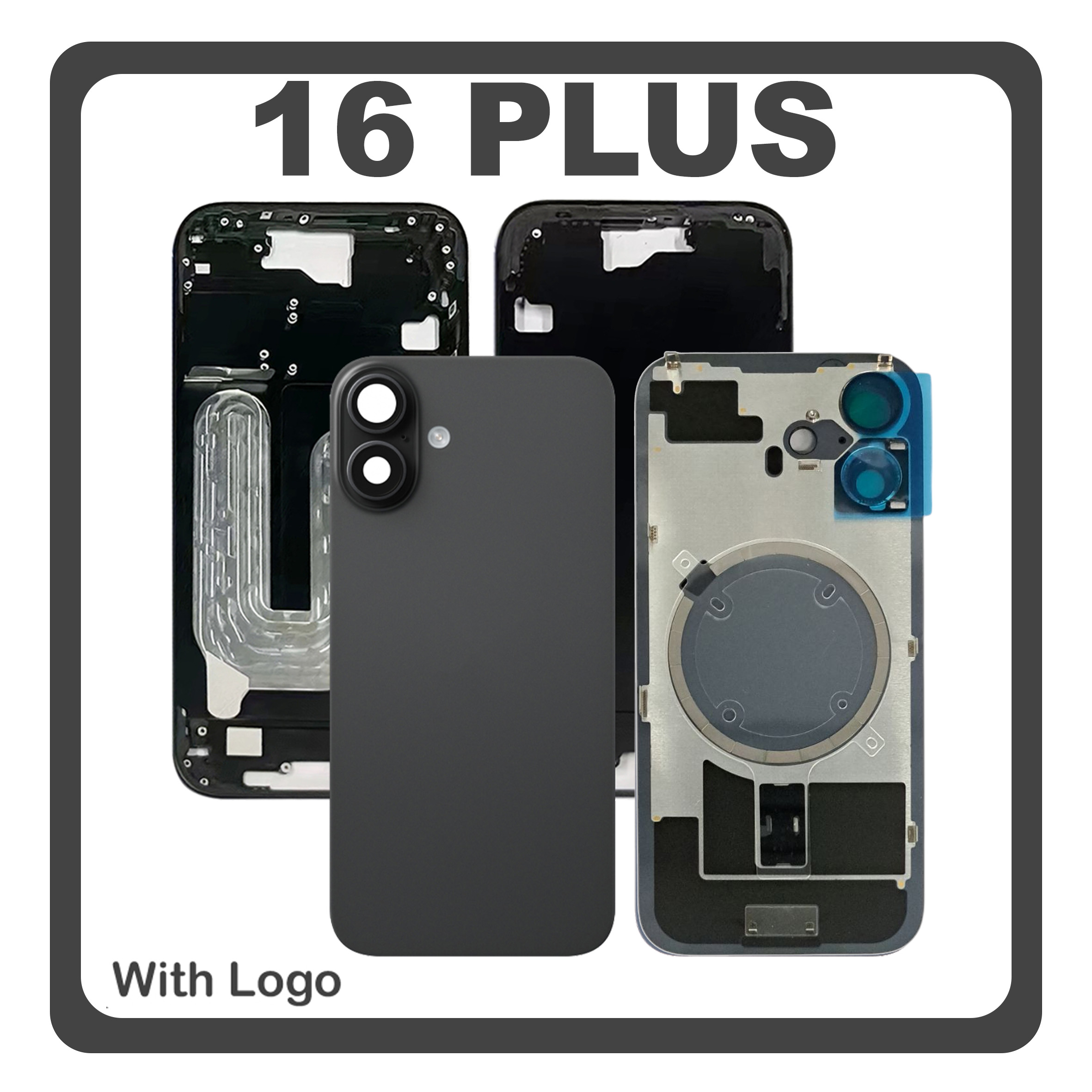 HQ OEM Συμβατό Με Apple iPhone 16, iPhone16 (A3287, A3081) Rear Back Battery Cover Πίσω Κάλυμμα Καπάκι Πλάτη Μπαταρίας + Middle Frame - Housing + Camera Lens Τζαμάκι Κάμερας + Magsafe Black Μαύρο (Premium A+)