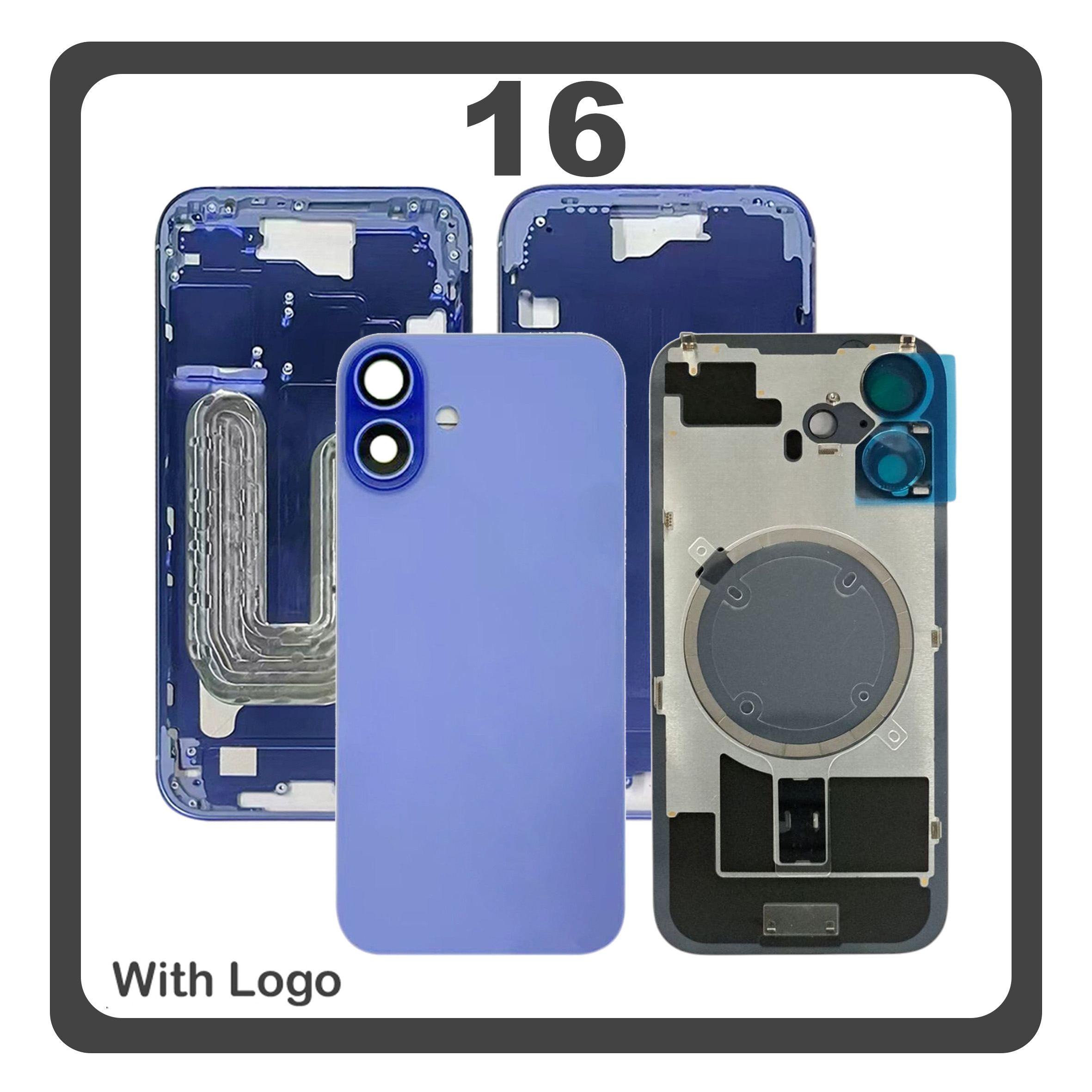 HQ OEM Συμβατό Με Apple iPhone 16, iPhone16 (A3287, A3081) Rear Back Battery Cover Πίσω Κάλυμμα Καπάκι Πλάτη Μπαταρίας + Middle Frame - Housing + Camera Lens Τζαμάκι Κάμερας + Magsafe Ultramarine Μπλε (Premium A+)