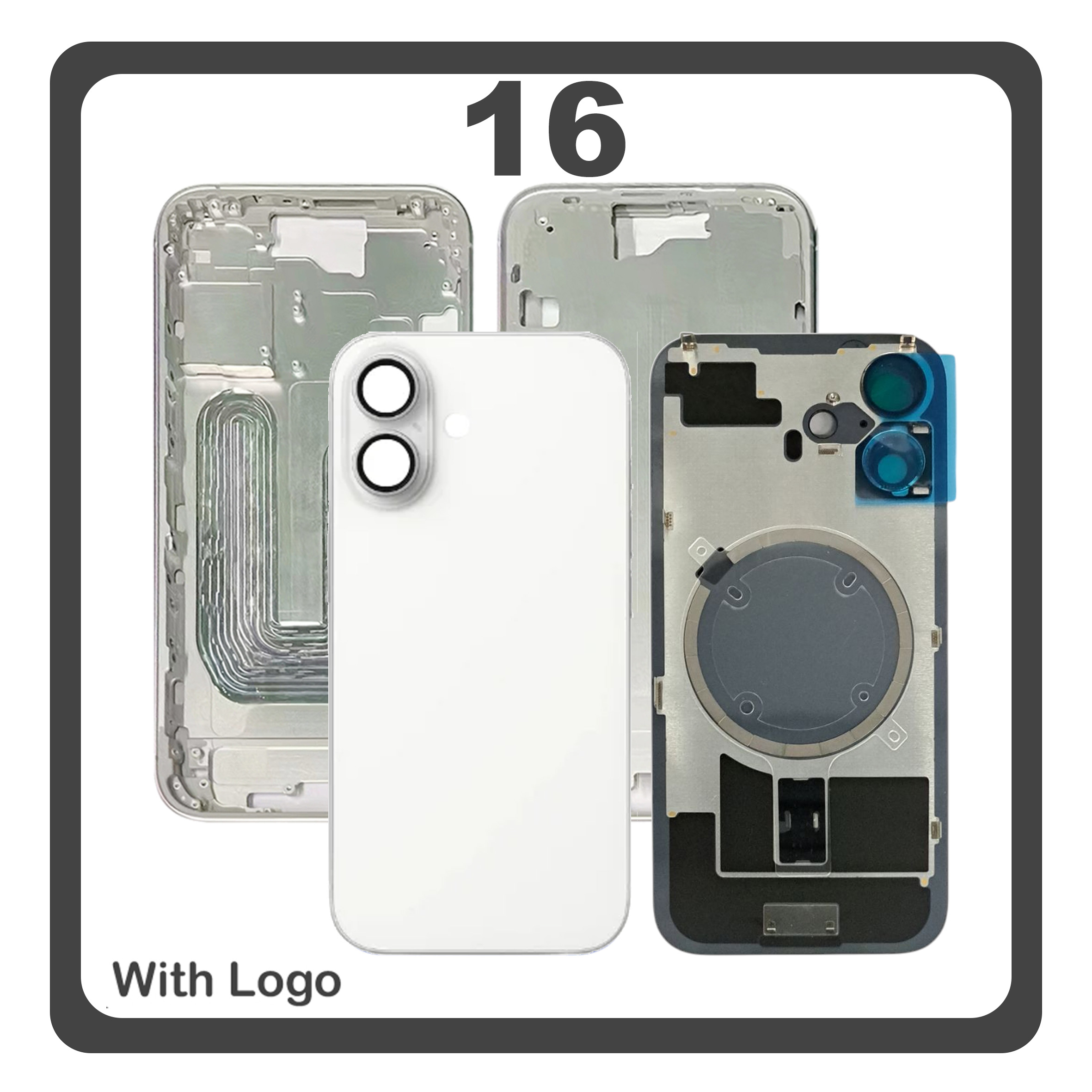 HQ OEM Συμβατό Με Apple iPhone 16, iPhone16 (A3287, A3081) Rear Back Battery Cover Πίσω Κάλυμμα Καπάκι Πλάτη Μπαταρίας + Middle Frame - Housing + Camera Lens Τζαμάκι Κάμερας + Magsafe White Άσπρο (Premium A+)