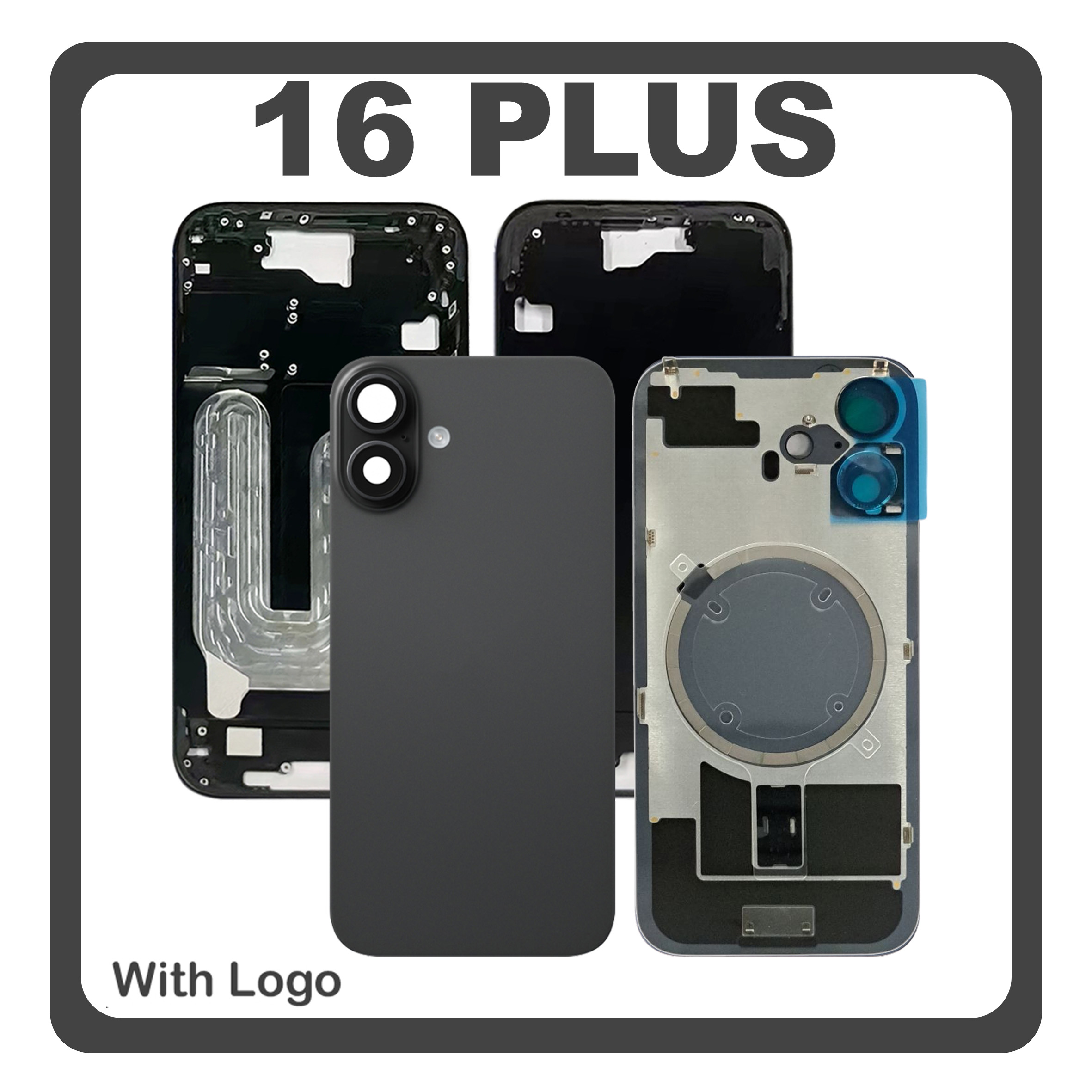 HQ OEM Συμβατό Με Apple iPhone 16 Plus, iPhone 16+ (A3290, A3082) Rear Back Battery Cover + Middle Frame - Housing + Camera Lens + Magsafe Black Μαύρο (Premium A+)