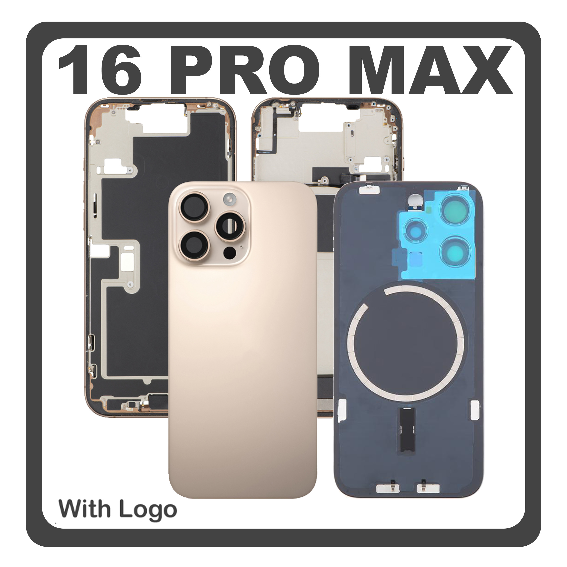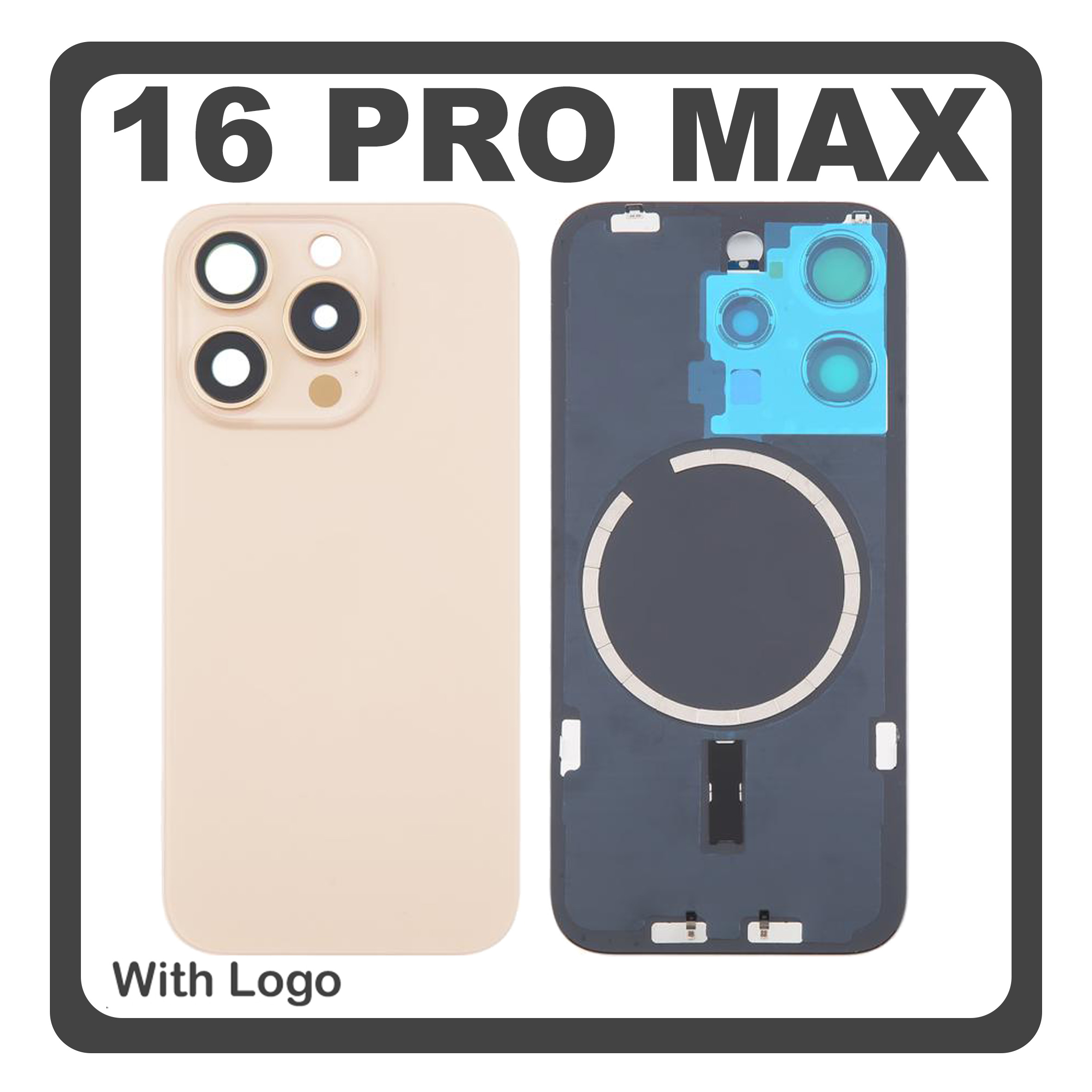 HQ OEM Συμβατό Με Apple iPhone 16 Pro Max, iPhone 16 ProMax (A3296, A3084) Rear Back Battery Cover Middle Frame - Housing Πίσω Κάλυμμα Καπάκι Πλάτη Μπαταρίας + Camera Lens Τζαμάκι Κάμερας + Magsafe + Sim Tray Desert Titanium Χρυσό (Premium A+)