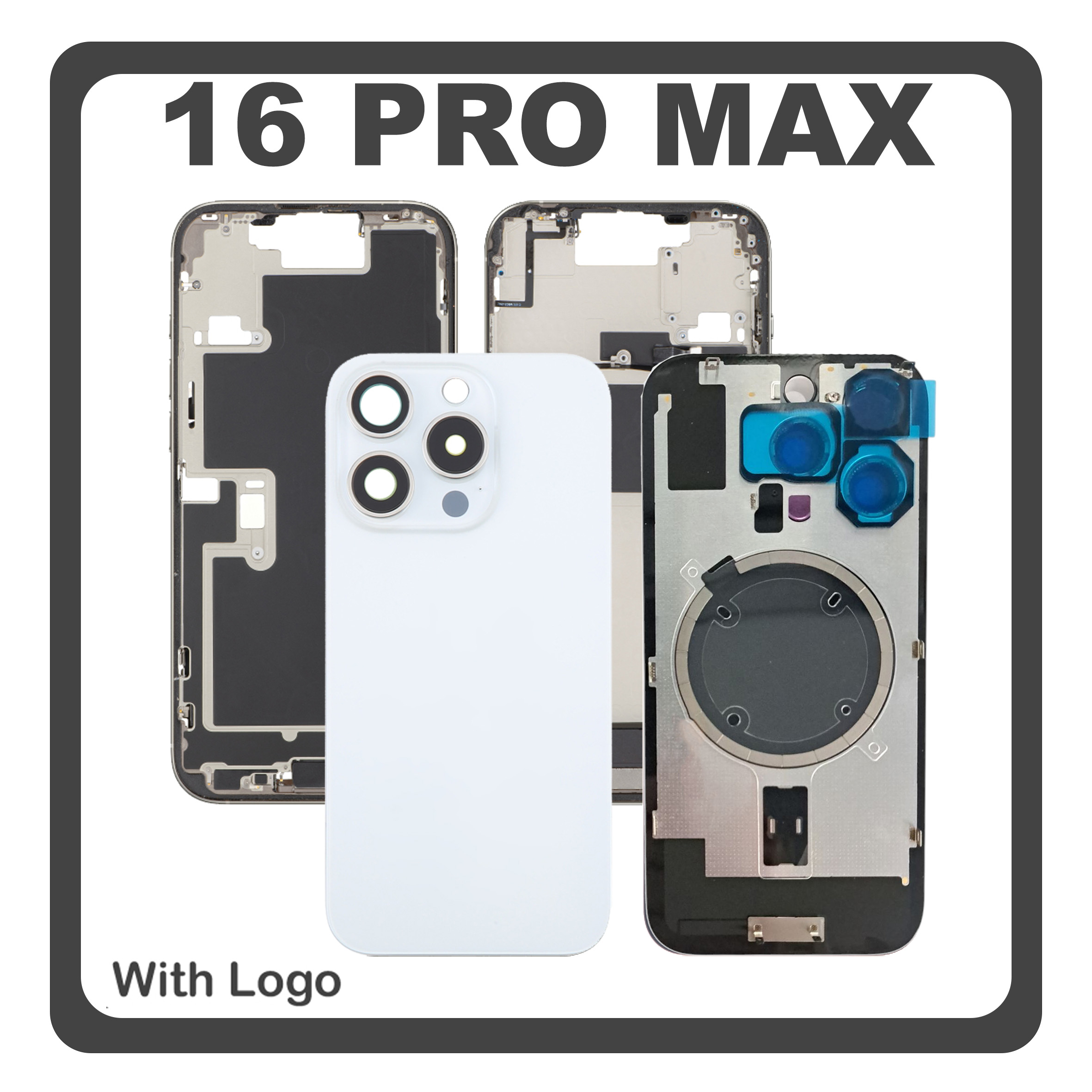 HQ OEM Συμβατό Με Apple iPhone 16 Pro Max, iPhone 16 ProMax (A3296, A3084) Rear Back Battery Cover Middle Frame - Housing Πίσω Κάλυμμα Καπάκι Πλάτη Μπαταρίας + Camera Lens Τζαμάκι Κάμερας + Magsafe + Sim Tray White Titanium Άσπρο (Premium A+)