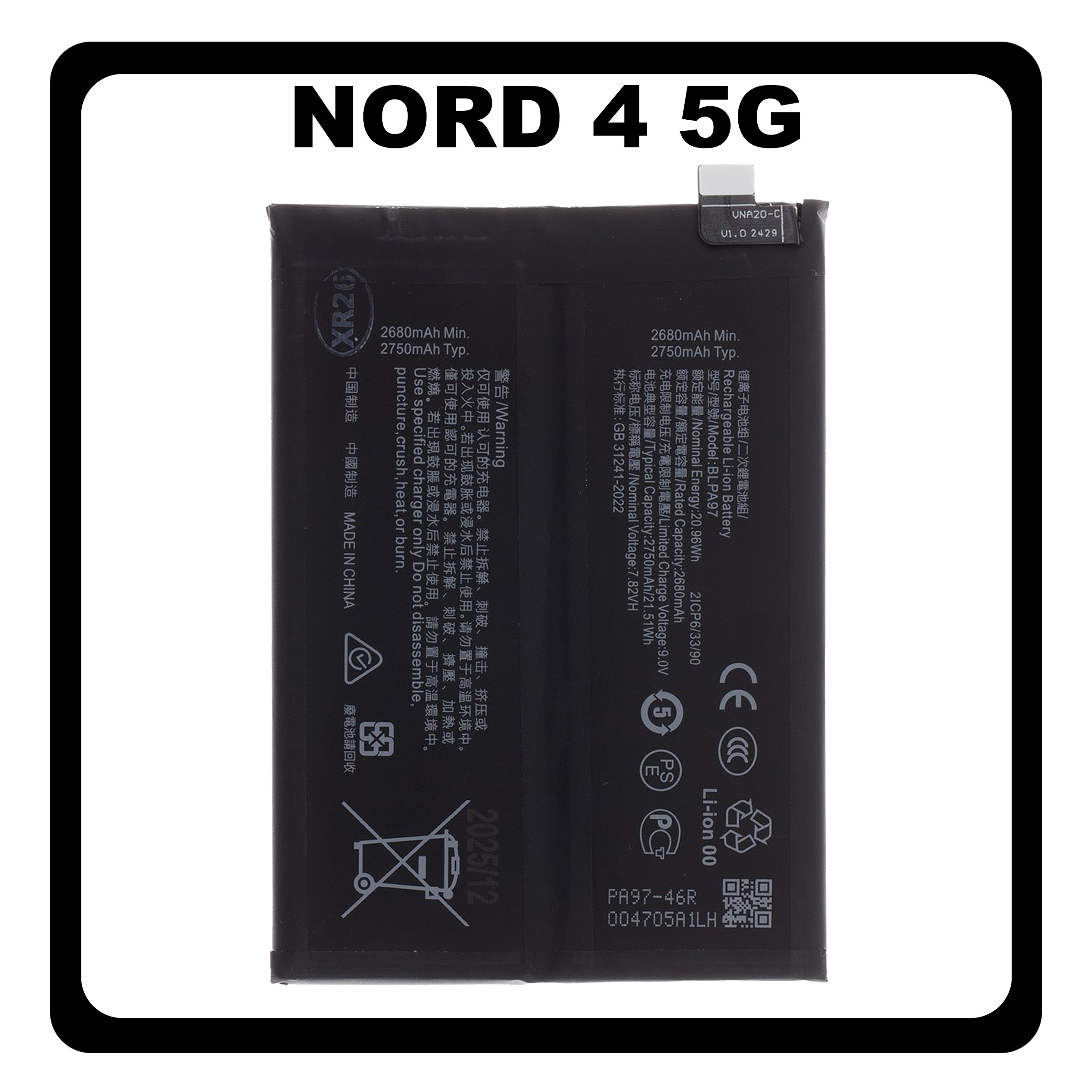 HQ OEM Συμβατό Με OnePlus Nord CE 4 5G (CPH2663, CPH2661) BLPA97 Battery Μπαταρία Li-Ion 5500 mAh Bulk (Premium A+)