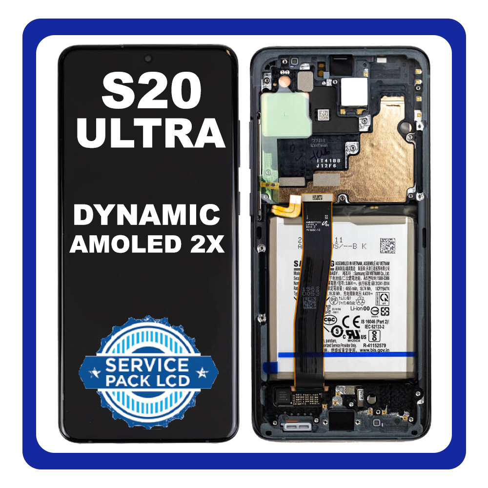 Γνήσια Original Samsung Galaxy S20 Ultra (SM-G988B/DS) Dynamic AMOLED LCD Display Screen Οθόνη + Touch Screen DIgitizer Μηχανισμός Αφής + Frame Πλαίσιο + Camera + Battery Μπαταρία Black Μαύρο GH82-31208A (Service Pack By Samsung)